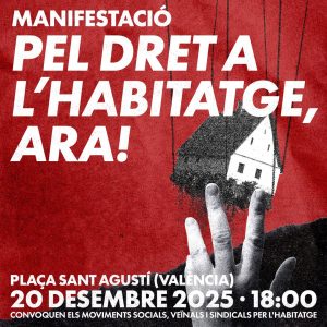 Amics del Carme, com ha fet en les dues darreres manifestacions, s’adhereix a la manifestació i al manifest “Pel dret a l’habitatge, ara”, promugoda per diverses entitats valencianes. El dret a l’habitatge no és una aspiració, sinó un Dret, per això cal que totes les administracions, sense excepció ni excuses, assumisquen la seua responsabilitat directa i implementen de forma immediata i en acord amb els Moviments socials, veïnals i sindicals, […]